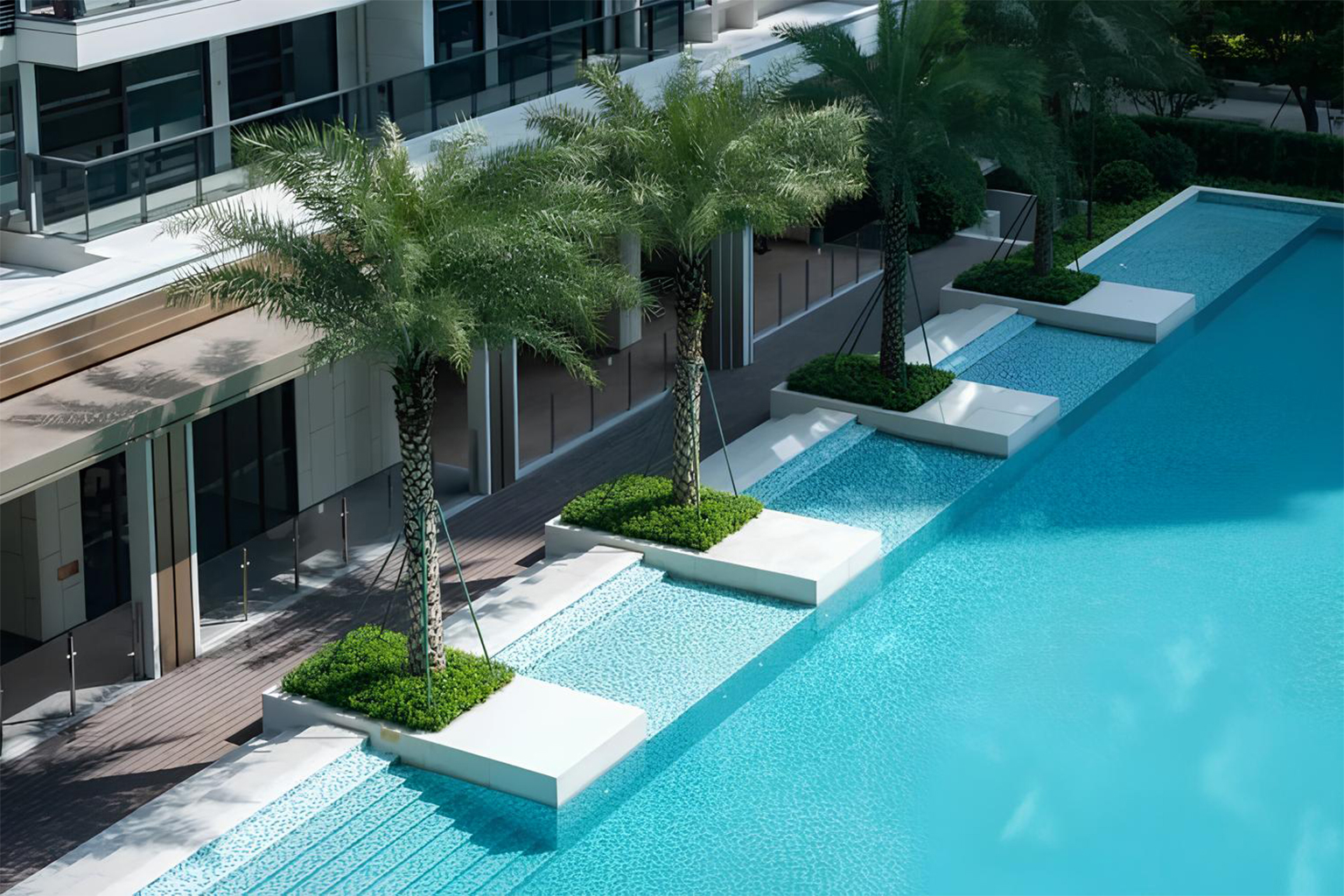 - Landscaped gardens with seating zones